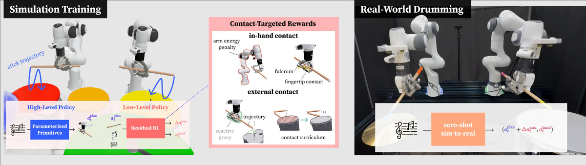 Когда смотришь на темп, с которым ИИ осваивает новые территории - пишет код, ставит диагнозы, побеждает чемпионов мира в Го, - из подсознания всплывает довольно тоскливый вопрос: а зачем вообще учить ребёнка чему-то? Зачем ему учиться медицине, юриспруденции, музыке, если умный алгоритм справится лучше? Если вас посещает порой эта грустная мысль, - есть отличное лекарство: почитайте новости раздела «робототехника» на arXiv. Легчает сразу. И вот тому наисвежайший пример: проект DexDrummer [1]- крутая попытка научить роботизированные руки играть на барабанах. Исследователи не поленились: иерархическая двухуровневая система управления, симулированная среда с полным комплектом ударных (малый барабан, том, райд, хай-хет, крэш), реальные испытания на руках с двадцатью степенями свободы. Отдельная инженерная поэзия - «контактный учебный план», обучающий робота держать палочку большим и указательным пальцами и «штрафной параметр за избыточные движения рукой». Результат? Он есть: робот может по