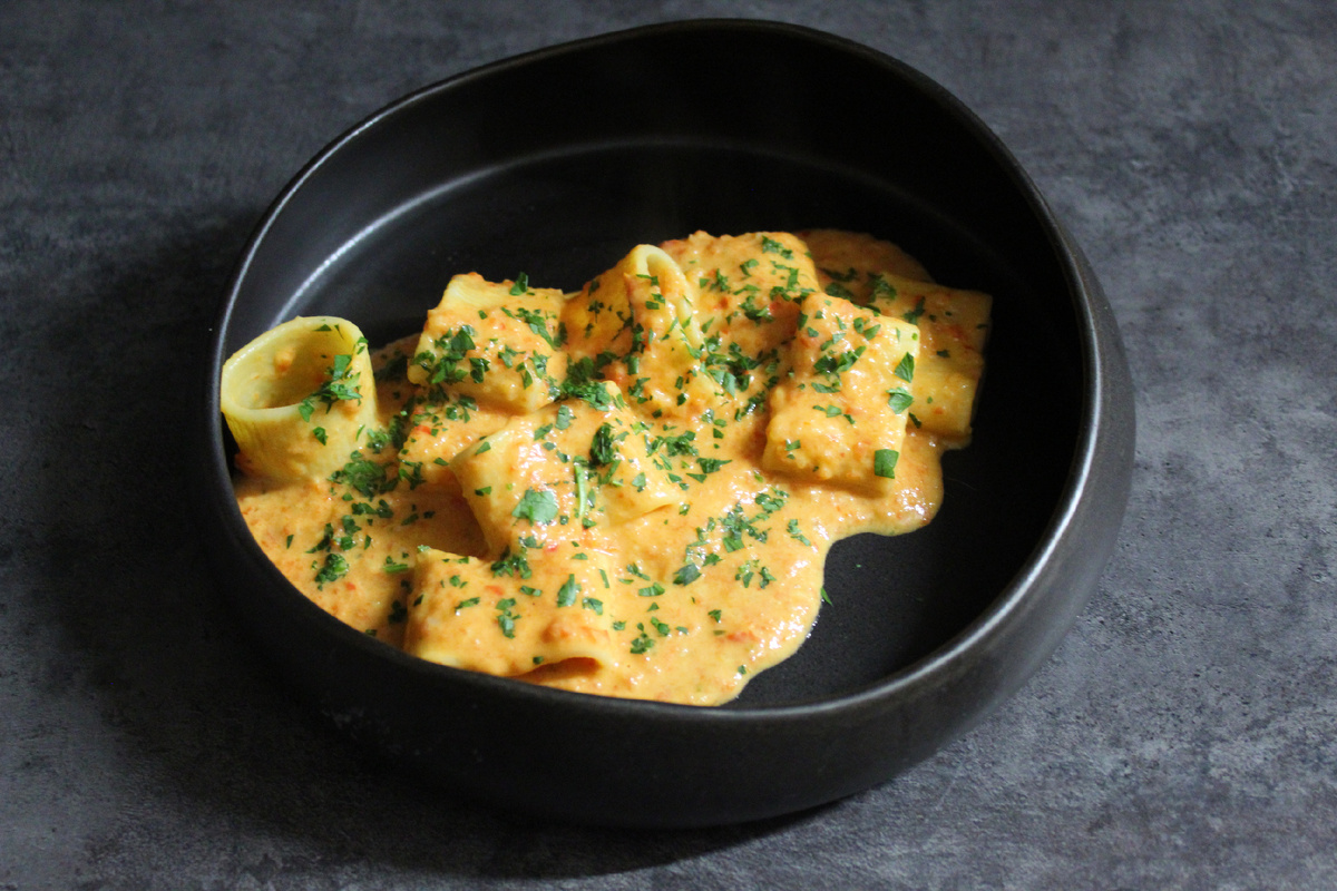 📋 Паста Страчателла - 200 гр. Помидоры - 5 шт. Сладкий перец - 2 шт. Лук - 1 шт. Чеснок - 3 зубчика Оливковое масло - 1 ст. л. Соль - 1 ч. л. Перец молотый - ½ ч. л. Розмарин Тимьян Петрушка Это нежное блюдо, навеянное итальянской кухней, которое покорит вас своим богатым вкусом и ароматом. Сочные томаты, сладкий перец и тающий сыр страчателла создают неповторимую симфонию вкусов, где каждый ингредиент играет свою особенную роль. Включаем духовку на 170 ℃. Пока она разогревается, нарезаем пополам помидоры, сладкий перец, лук, и чистим три зубчика чеснока. Перемешиваем овощи с оливковым масло,тимьяном,розмарином, солью, черным перцем и, переложив на противень, запекаем 45 минут. Сварить используемые макаронные изделия, согласно инструкции на упаковке. Достаем овощи из духовки и измельчаем с помощью блендера, добавив страчателлу и воду из-под пасты, доведя до нужной густоты. Измельчаем как можно мельче петрушку. Перемешиваем нашу пасту с соусом и подаем с мелко нарезанной петрушкой. П