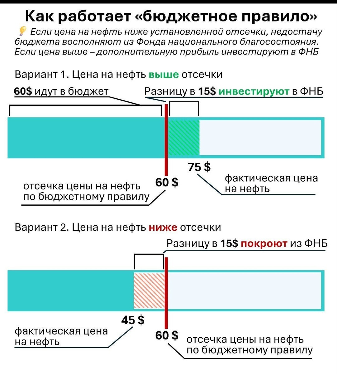 К чему ведет решение председателя правительства Российской Федерации? Важные новости как всегда проходят незаметно в ленте информационного шума. Сегодня Михаил Мишустин постановлением закрепил остановку работы бюджетного правила 👉О чем речь В России существует механизм стабилизации доходов бюджета от продажи нефти. Назначается цена отсечения (сейчас 59$), если нефть продается дороже — лишние деньги уходят в Фонд национального благосостояния (ФНБ), на них покупается золото и иностранная валюта. Если нефть дешевле — недостача в бюджете покрывается из Фонда национального благосостояния (на рисунке — грубое отображение работы правила) С начала СВО объем ликвидных средств ФНБ (то что легко продать) сократился больше чем вдвое (8,43 трлн ₽ → 4,04 трлн ₽), а после начала СВО ВС США в Иране минфин приостановил валютные операции. Не просто так — решили пересмотреть цену отсечения нефти. Причины: ▪️слишком дешевая нефть «убивала» запасы ФНБ ▪️постоянные продажи валюты сильно укрепляли рубль.