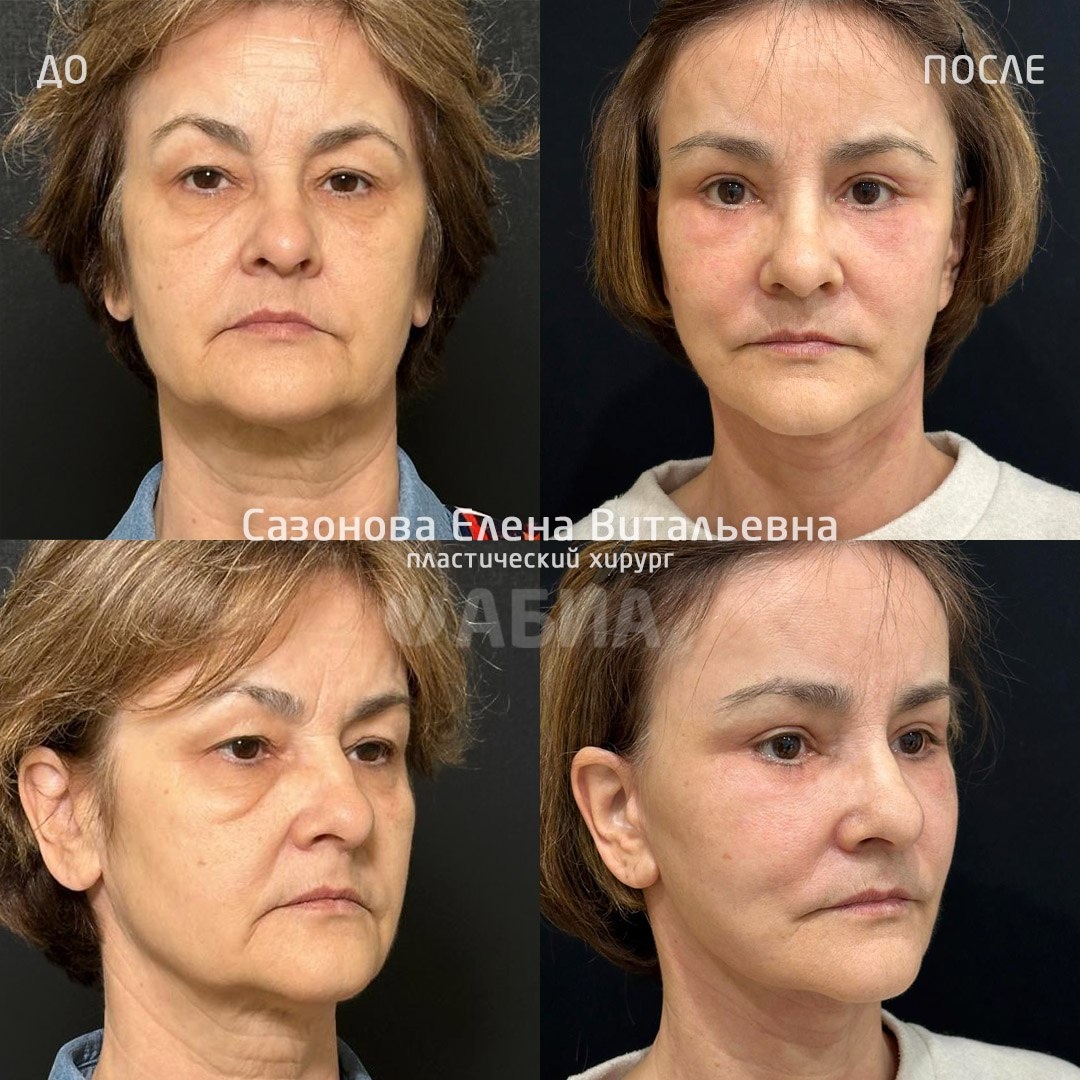 В данном случае выполнены: эндоскопический лифтинг верхней трети, глубокая подтяжка нижних 2/3 лица и шеи со SMAS-пластикой, блефаропластика верхних и нижних век. Результат через 2 месяца - уже заметно более гармоничные контуры и свежий взгляд. Финальный эффект ещё формируется, так как сохраняются отёки. #подтяжкалица_Сазонова
