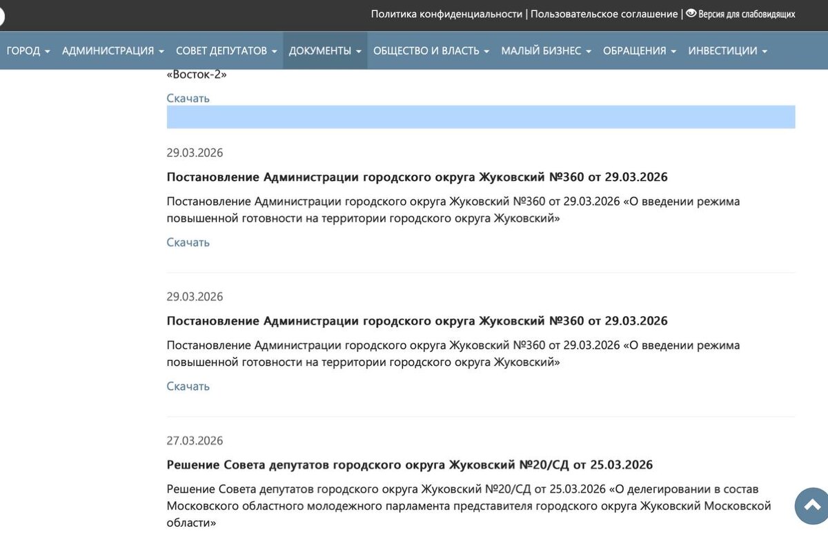 Фрунзе,12, причем сразу два варианта одного и того же документа На сайте администрации задним числом появились два документа, это одно и то же постановление администрации № 360 от 29.03.20 о введении с 17 часов 29 марта режима повышенной готовности в МКД, расположенном по адресу: ул. Фрунзе, д. 12, для УК «Наукоград» и администрации городского округа Жуковский. Так власти отреагировали на пора в воскресенье, который заставил более ста жителей эвакуироваться. Версии постановления отличаются одним пунктом - предписанием Управлению ЖКХ администрации направить обращение в Фонд капитального ремонта Московской области. Во всем остальном они идентичны: генеральному директору «Наукограда» Альберту Шагизиганову предписано обеспечить своевременное информирование ЕДДС-112 городского округа Жуковский и ДДС оперативных служб об изменении обстановки и ходе выполнения работ по ликвидации аварийной ситуации; Управлению безопасности, предупреждения и ликвидации чрезвычайных ситуаций, решения задач гр