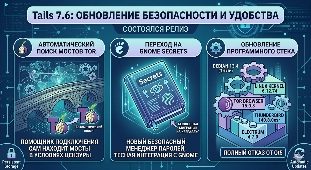 Вышла новая версия специализированного дистрибутива Tails 7.6, ориентированного на обеспечение конфиденциальности и анонимности. В этом выпуске разработчики уделили особое внимание упрощению доступа к сети Tor в условиях цензуры и обновлению ключевых пользовательских инструментов. Главным нововведением стала встроенная функция поиска мостов. Теперь помощник подключения к Tor самостоятельно определяет, когда прямое соединение блокируется, и автоматически запрашивает подходящие мосты через API Moat. Ранее пользователям в регионах с жесткой цензурой приходилось искать и вводить адреса мостов вручную. В Tails 7.6 произошла смена стандартного менеджера паролей: на смену KeePassXC пришло приложение Secrets. Этот шаг обусловлен стремлением к более тесной интеграции с рабочим столом GNOME и улучшению доступности (например, корректная работа экранной клавиатуры). Базы данных KeePassXC полностью совместимы с Secrets, поэтому миграция данных происходит бесшовно. Дистрибутив переведен на пакетную