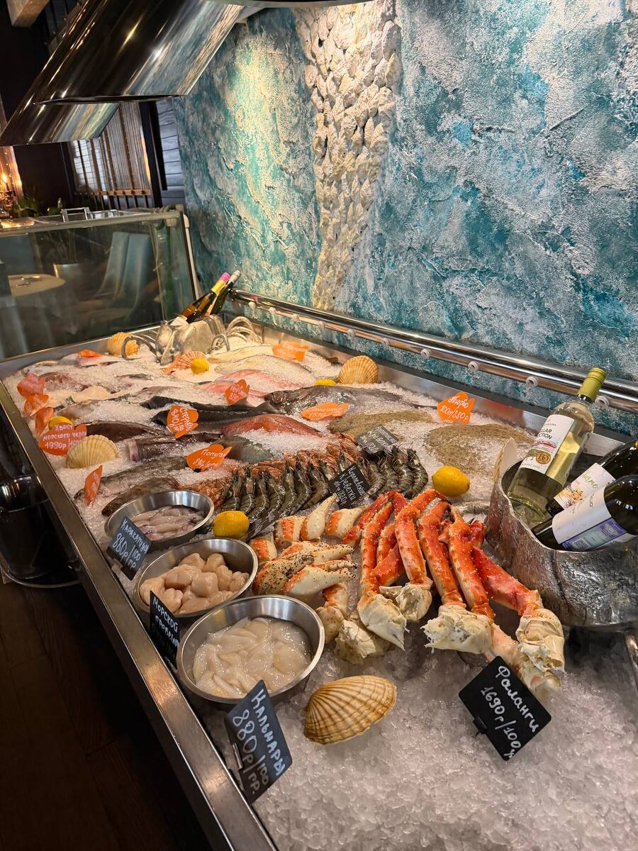 Всем привет! В своем блоге я рассказываю, как экономить на ресторанах в Москве, при этом делать это просто и без лишних стрессов, делаю обзоры на рестораны и просто делюсь подборками на все случаи жизни. Сегодняшний обзор посвящен одному из старейших и самых уважаемых рыбных заведений столицы — ресторану «Рыбный Базар» в Трёхпрудном переулке. Это место с 22-летней историей, которое по праву считается раем для любителей морепродуктов и средиземноморской кухни. Главная гордость ресторана — огромная ледяная витрина. Здесь можно найти практически всё: от привычных сибаса и дорадо до экзотического попугая или редкой чёрной трески. Любой ваш выбор повара приготовят именно так, как вы пожелаете: на гриле, на углях, в соли или на пару. Атмосфера здесь уютная и спокойная, идеально подходящая как для делового обеда, так и для неспешного семейного ужина. Начать обед рекомендую с Севиче из гребешка с гуакамоле. Это идеальный пример того, как свежесть морепродуктов встречается с нежной текстурой а