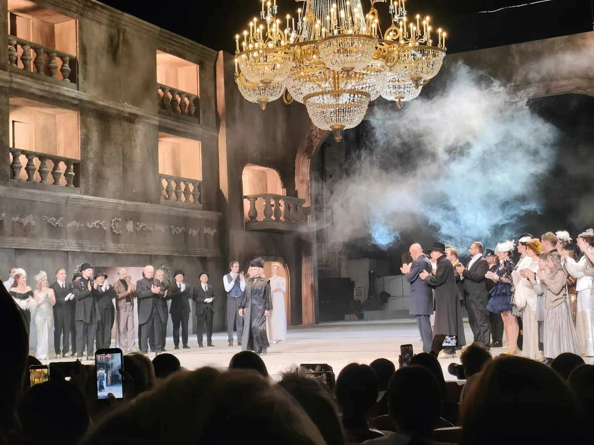 Мимо, не задерживаясь, проносятся поезда. Оркестр давно на взводе, растянут огромный транспарант «Добро пожаловать», а гостьи всё нет. И вдруг в глубине сцены вспыхивают два буферных фонаря — словно глаза неведомого зверя. Далёкое свечение приближается, и на сцену в буквальном смысле въезжает паровоз в натуральную величину. Эта громада идёт прямо на зрительный зал, и на секунду кажется, что катастрофу уже не остановить. Но локомотив замирает с характерным лязгом, а в клубах дыма эффектно, почти мистически, появляется… Воланд в юбке: пожилая дама в чёрном, окружённая свитой.