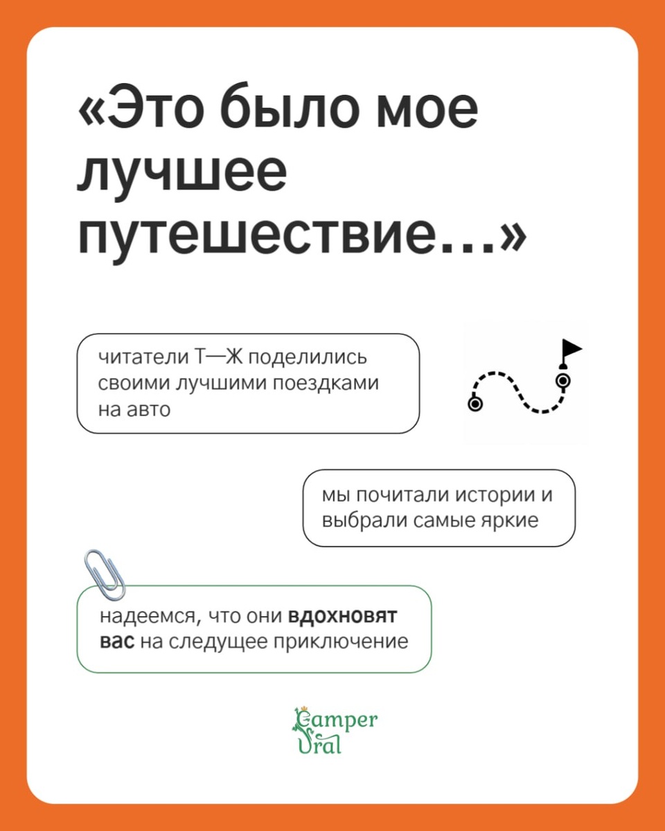 Знаете, что общего у всех этих историй? Почти никто не вспоминает пятизвездочные отели. Все пишут о свободе, природе, причудах погоды и красивых видах Люди в одиночку едут 17 000 км до Владивостока. Везут котов и собак через полстраны. Пересекают Норвегию с севера на юг за одну поездку. Листайте карточки – собрали для вас атмосферные рассказы путешественников А теперь ваша очередь! Расскажите про свое лучшее автопутешествие: маршрут, километры, с кем ехали, что запомнилось больше всего 👇🏻