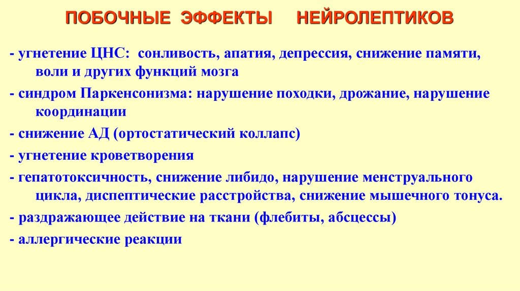 Особенно много проблем пациенту, доставляют трициклические антидепрессанты и т.н. "типичные" нейролептики. И те, и другие из-за обилия побочных эффектов. Наиболее злокачественным из них, является нейролептический синдром (G21.0 по МКБ-10).