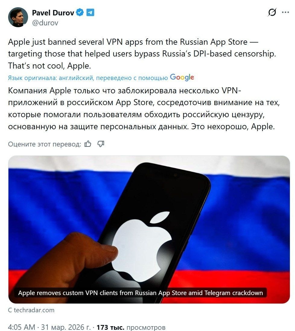Павел Дуров раскритиковал Apple из-за блокировки VPN-сервисов В соцсети X он обвинил корпорацию в поддержке российского «цензурного аппарата». По мнению основателя Telegram, компания сознательно идет на уступки властям, так как боится потерять доходы на местном рынке. Предприниматель назвал такие действия «очень краткосрочной стратегией». «Apple только что заблокировала несколько VPN-приложений в российском App Store, сосредоточив внимание на тех, которые помогали пользователям обходить российскую цензуру и защищали их персональные данные. Это не круто, Apple», — заявил Дуров. ➡️Ранее Apple удалила более 20 таких приложений из российского App Store. В официальных письмах компания объяснила это требованиями Роскомнадзора и наличием в софте «незаконного контента». @setters_media