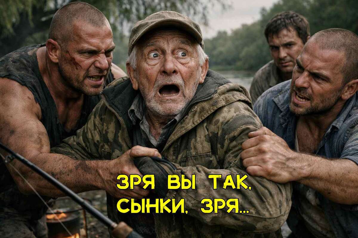 -Ребята, да какие у меня деньги? Я пенсионер, на рыбалку пришёл. Изба далеко, километра три и метров тысяча через лес. Давайте сначала ухи поесть, раз уж приготовил. А потом отведу, обещаю. Голодным идти тяжело.