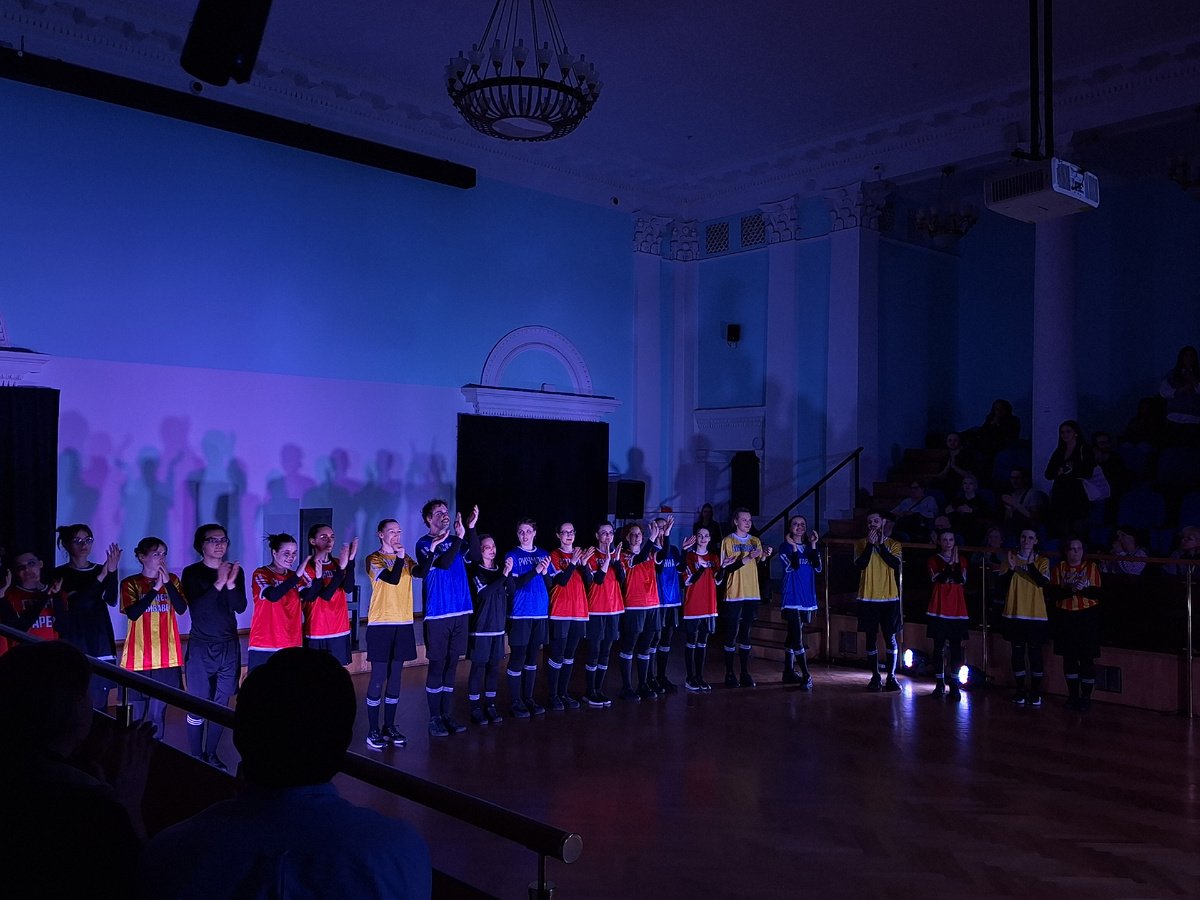 Второй пролог случился уже перед началом спектакля. И скажу, что это прямо было очень кстати! Мне кажется, все мои коллеги были благодарны таким вводным и шли подготовленными на спектакль. Я не могу назвать себя большим знатоком Шекспира (знаю, только если, общую канву произведений), а про футбол - я вообще молчу. Но, переживать на тему футбола совершенно не стоит: голы, пасы и пенальти исключительно в словесной шекспировской форме. От себя лично добавлю: имена на майках очень помогают сориентироваться и не терять нити интриг. Кстати, "Ричард III" - одна из самых населённых пьес Шекспира. Вместо того, чтобы копаться в голове в поиске имени героя - просто читаешь имя. Меня вообще через какое-то время перестала смущать спортивная форма и отсутствие исторических костюмов. А плюсом я вспомнила, что уже как-то видела эту пьесу в театре в классическом исполнении, но на этом все - больше я ничего не могла вспомнить( Ещё момент: кажется, я начала понимать то, что трагедия - это может быть очень смешно. Я наблюдаю это уже у второго режиссера (первым был Василиос Самуркас с древнегреческими мифами). Было недавно ещё пара спектаклей по русской классике, где мне серьезности не хватило. Теперь надо подумать про это...