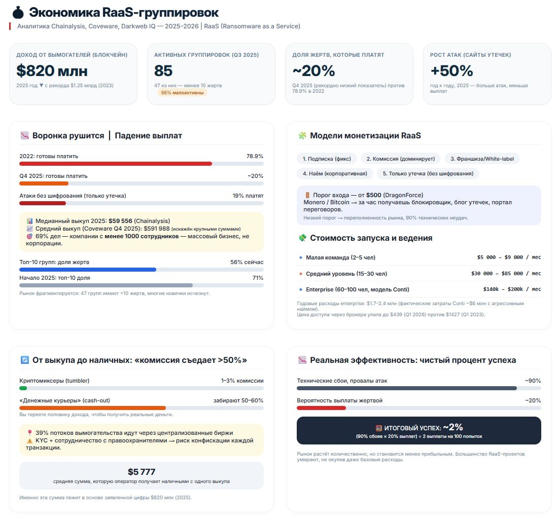 Цифры, которые формируют правила игры: 📉 Готовность платить упала с 78,9% (2022) до ~20% (конец 2025). Жертвы наконец поняли, что платить - означает финансировать следующую атаку. 📉 Реальный доход с одного инцидента после обналички — $5 777. Миксеры и «денежные курьеры» забирают 50-60%. Остальное находятся под риском KYC на биржах (39% потоков все ещё идут через них, спасибо регуляторам). 📈 Конкуренция — 85 активных групп, из них 47 не набрали и 10 жертв. Порог входа крайне низкий: $500 — и вы владелец RaaS-франшизы. 📉 Конверсия в реальный выкуп: 2% (две выплаты на сто попыток). 90% технических проблем + 80% отказов платить. Не расслабляйтесь! Даже если рынок кризисный, число атак растет. Источник: https://privacyinsightsolutions.com/blog/raas-business-plan-unit-economics-2026 📱 Telegram | 🌐 ВК | 📲 MAX