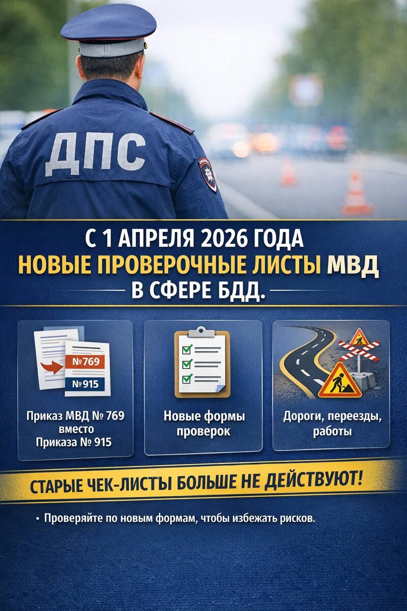 С 1 апреля 2026 года МВД применяет новые проверочные листы в сфере БДД. Основание — Приказ МВД России от 15.10.2025 № 769, который заменяет прежний Приказ МВД России от 27.11.2023 № 915. Что важно: существенного переворота в направлениях контроля нет, но обновлены сами формы проверок, по которым инспекторы будут оценивать соблюдение обязательных требований. Проверка по-прежнему касается содержания дорог, железнодорожных переездов, дорожных работ и технических средств организации дорожного движения. Для бизнеса это означает одно: ориентироваться на старые чек-листы уже нельзя. С 01.04.2026 внутреннюю самопроверку лучше проводить по новым формам, чтобы заранее увидеть риски и подготовиться к контролю. Правовая основа применения проверочных листов — статья 53 Федерального закона № 248-ФЗ.