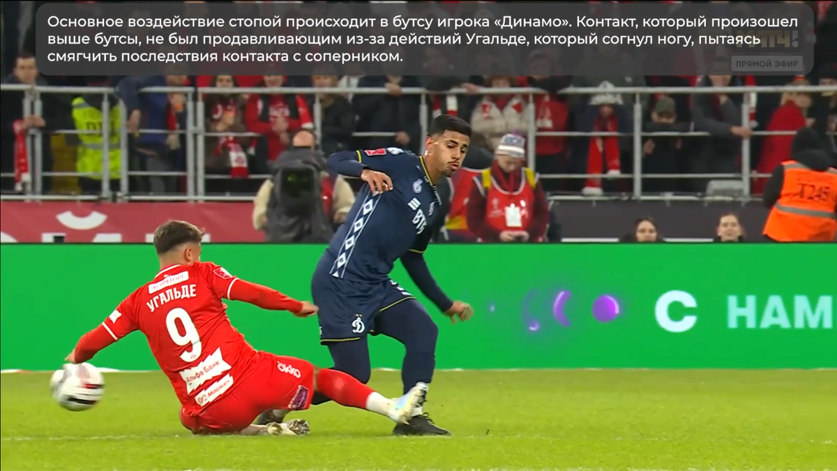 Основное воздействие стопой происходит в бутсу игрока «Динамо». Контакт, который произошел выше бутсы, не был продавливающим из-за действий Угальде, который согнул ногу, пытаясь смягчить последствия контакта с соперником.
