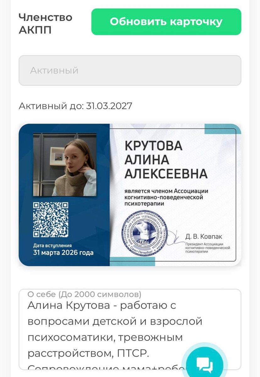 🥳 - мои документы прошли проверку и теперь официально я член Ассоциации Когнитивно-Поведенческой психотерапии как же я рада!✨ поддержите меня пожалуйста реакциями и теплыми комментариями Я это заслужила ❤️ Следующий шаг - сертификация по АСТ методу настроение - обнять весь мир 🌍 вот уже 2 месяца я живу, как мне кажется, на пределе своих личностных и профессиональных возможностей и получаю от этого удовольствие и я уверена, труд всегда будет оценен и принесет свои плоды - всему свое время ❤️ с трепетом, Алина в VK | DZEN | RUTUBE #с_трепетом_Алина #телесный_терапевт_мск #тревога #акпп #кпт #аст