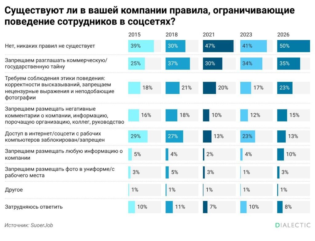 Каждая четвертая компания в России требует от персонала соблюдения правил при ведении личных блогов и страниц в интернете. Об этом сообщает Исследовательский центр портала Superjob. Кадровые аналитики зафиксировали масштабный сдвиг в корпоративной политике отечественных предприятий. Если три года назад правил поведения в цифровой среде не имели 41% организаций, то к весне текущего года их число выросло до 50%. Наниматели планомерно отказываются от стратегии тотального контроля. Прямой запрет на использование социальных сетей с рабочих компьютеров сегодня сохраняется лишь в 13% фирм, хотя ранее этот показатель составлял 23%. Вместо технических ограничений работодатели все чаще внедряют этические стандарты. Около 23% компаний требуют от подчиненных вежливости в комментариях и запрещают публикацию неподобающих фотографий. Каждое шестое предприятие официально установило запрет на размещение любой информации, которая может нанести урон репутации организации или руководства. Почти 10% компан