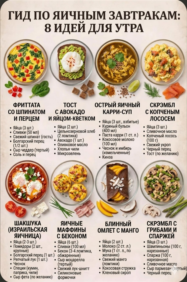 ! Мы все привыкли к банальной глазунье, но яичница может быть настоящим ресторанным блюдом, которое готовится за 10-15 минут. Яйца — это идеальный источник полноценного белка и полезных жиров, которые дают долгое чувство сытости и энергию на всё утро. Листайте карточку! Мы собрали для вас 8 нескучных и очень вкусных комбинаций: от классической Фриттаты до изысканного Скрэмбла с лососем и необычного Карри-супа. Чем это круто? Легко адаптировать: Нет лосося? Положите ветчину. Нет шпината? Подойдет руккола. Польза для мозга и тела: Белок, холин для памяти и жирные кислоты. Вкус как в кафе: Но в разы дешевле и полезнее! 💡 Сохраняйте этот конструктор в закладки 🔖, чтобы больше никогда не думать: «Что же приготовить на завтрак?». 👇 А теперь самое интересное: Какой из этих 8 вариантов вы готовы приготовить уже завтра утром? Напишите цифру или название в комментариях! Я голосую за Шакшуку 🔥, а вы? #завтраки #рецептыизяиц #идеизавтрака #чтоприготовитьназавтрак #вкусныйзавтрак #яичниц
