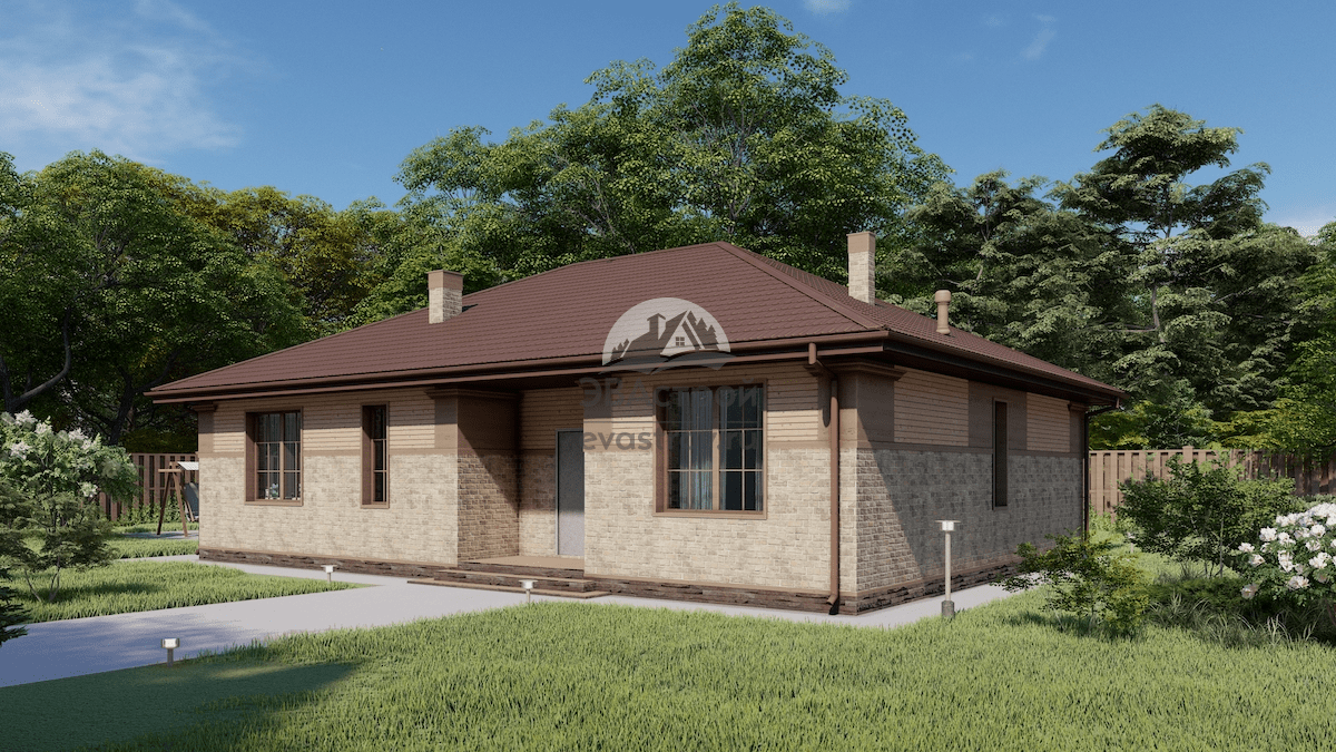 Номер проекта: 107-57 (П111) Разделы проекта: Архитектурный и Конструктивный разделы Узнать о проекте больше можно на сайте evastroy.ru или по телефону +7 (495) 175-30-40 Одноэтажный дом с тремя спальнями, общей площадью 139 м2, выполнен в европейском стиле. Среди его плюсов: С крыльца заходим в просторную прихожую (10 м2); справа предусмотрен шкаф во всю стену, слева — шкаф поменьше; в пространстве у двери можно расположить обувной пуфик, подставку для зонтов и пр. Рядом с прихожей — котельная (5.4 м2) и кладовая (4 м2) в одном помещении. Гостиная (28,5 м2) и кухня (15 м2) также находятся в общем зале, с единым входом из коридора и дверью на террасу. Кроме мастер-спальни (12,5 м2) предусмотрено еще две комнаты, площадью 14 м2, и общий санузел. Одна из этих спален обособлена от других. Дом подходит для семьи с двумя детьми; есть все необходимое — спальни, общая зона, места хранения, терраса, котельная для отопления в холодный сезон. Также это неплохой вариант для дачи. Тип фундамента —