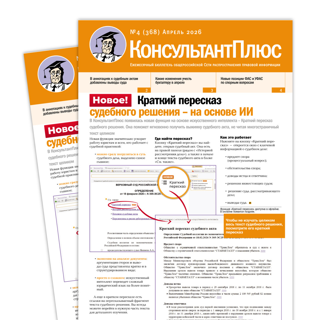 Читайте в выпуске: 🔹«Новое! Краткий пересказ судебного решения – на основе ИИ» 🔹«Кнопка «Выводы суда» в аннотациях к судебным актам» 🔹«Какие изменения учесть бухгалтеру в апреле» 🔹«Новые позиции ФАС и УФАС по спорным вопросам в сфере закупок и рекламы» 🔹«Новости регионального законодательства» 🔹«Фишки КонсультантПлюс. Калькуляторы» Перейти к выпуску ⏩