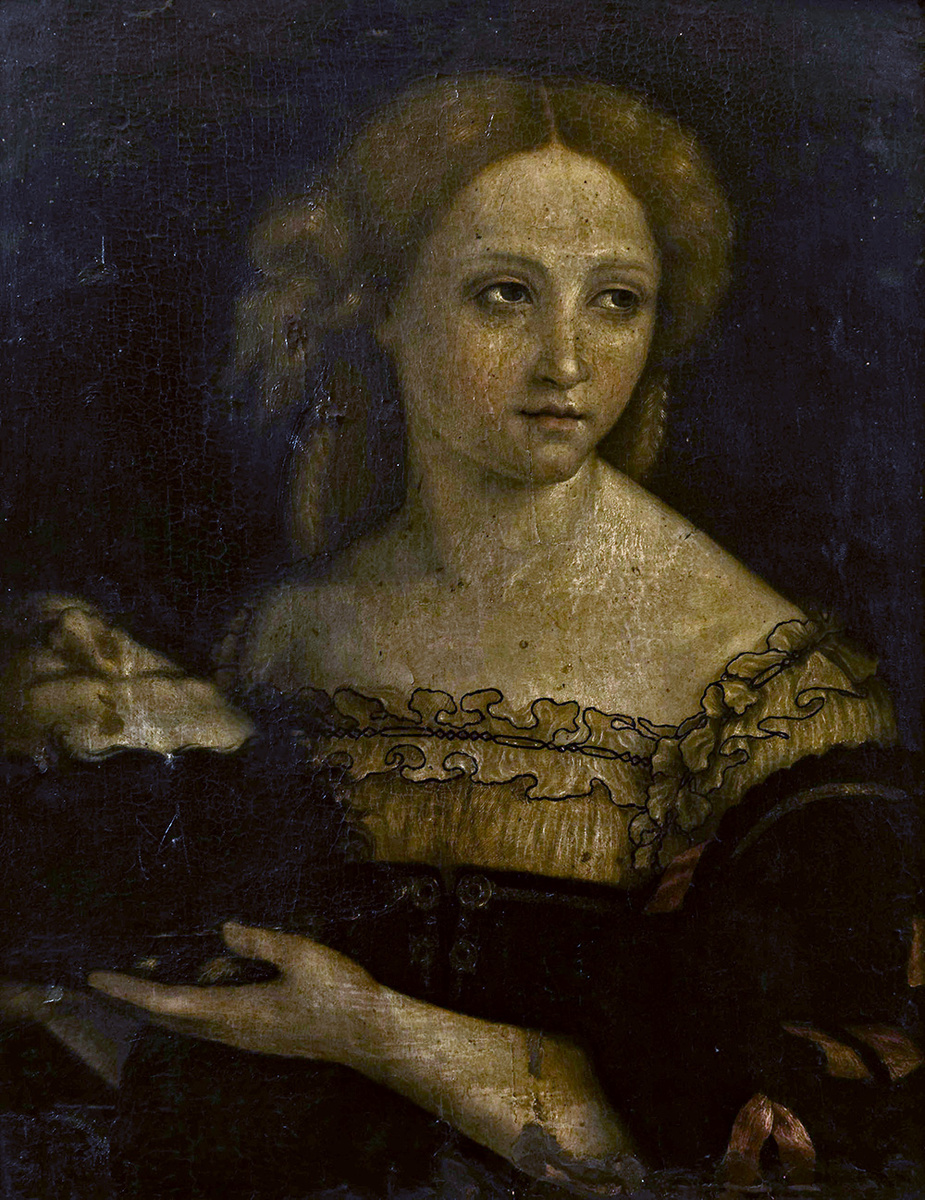 До сих пор точно не ясно, когда эта картина попала в коллекцию Боргезе — она не фигурирует ни в инвентарных списках Боргезе XVII и XVIII веков, ни в Inventario Fidecommissario 1833 года. Первые сведения о картине относятся к 1893 году, когда Адольфо Вентури назвал её работой флорентийской школы. Однако его атрибуция позже была отвергнута Бернардом Беренсоном (1936), который предложил имя Джулио Кампи (1502–1572). Роберто Лонги (1928) связал картину с кругом художников семейства Пальмы. Что, в свою очередь, было отвергнуто Паолой делла Пергола (1955), которая приписала её неизвестному художнику, перенеся дату ее создания на XVII век. Как и в случае с вопросом об авторстве, сохраняются сомнения и относительно сюжета работы. Отрубленная голова заставила некоторых критиков предположить, что женщина это Юдифь, бесстрашная вдова из Вефулии, которая отрубила голову полководцу Олоферну. Между тем, другие отождествляют её с Иродиадой, порочной любовницей Ирода Антипы, которая, согласно Еванг