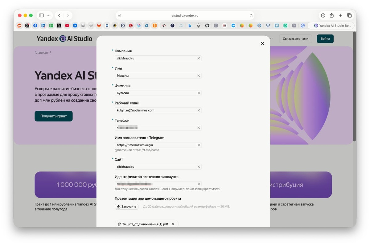 Подаюсь на грант Яндекс.ИИ. Чуть позже напишу, что дает. Заняло 5 минут на заполнение формы. Легко найдете форму подачи. @clickfraud.ru