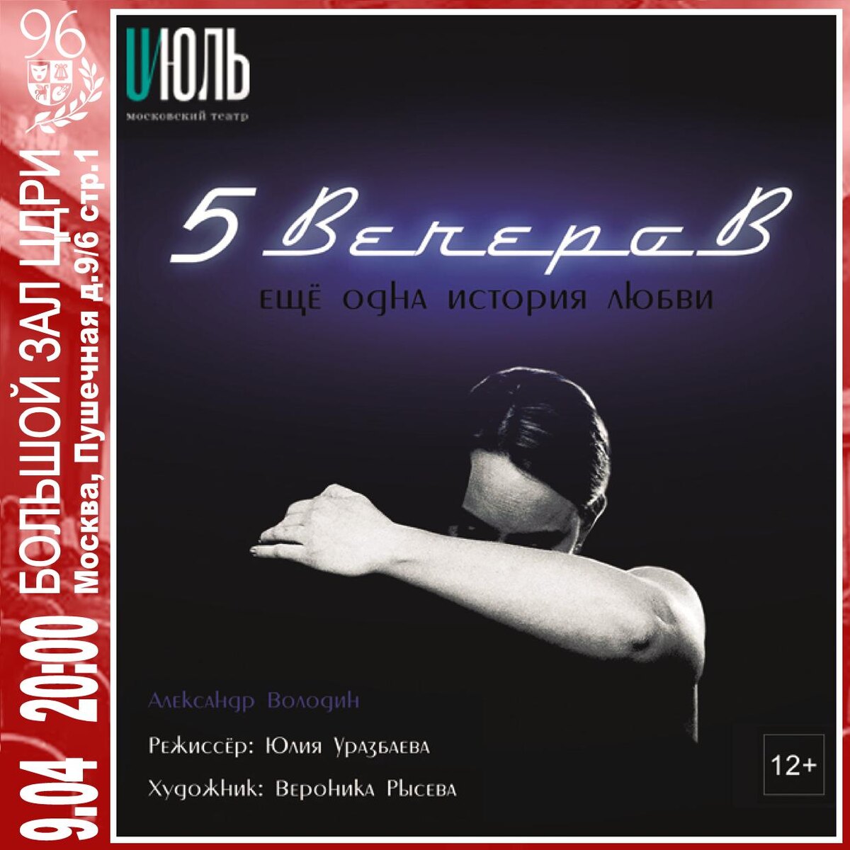 Московский театр «ИЮЛЬ» «5 вечеров» — Александр Моисеевич Володин Как пять обычных вечеров могут изменить всю жизнь? Можно ли на протяжении семнадцати лет любить одну женщину? Как заполнить пустоту, образовавшуюся из-за не сложившейся личной жизни? Герои по-разному решают для себя эти вопросы. А тем временем, для вас весь вечер будет играть живая музыка. Режиссёр-постановщик: Юлия Уразбаева Художник-постановщик: Вероника Рысева Художник по свету: Степан Заметельский Музыкальное оформление: Дарья Гарбузняк Действующие лица и исполнители: Тамара — Александра Мамедова / Надежда Филимонова Ильин — Владимир Музалев / Дмитрий Самойлов Тимофеев — Алексей Арутюнов / Максим Зубарев / Сеймур Мамедов Слава — Евгений Скляров Катя — Маргарита Аветян / Татьяна Коняхина Зоя — Татьяна Коняхина / Наталья Ситдикова / Мария Чистикова Официанты и посетители переговорной — Маргарита Аветян, Виталий Журавлев, Сеймур Мамедов, Наталья Сит