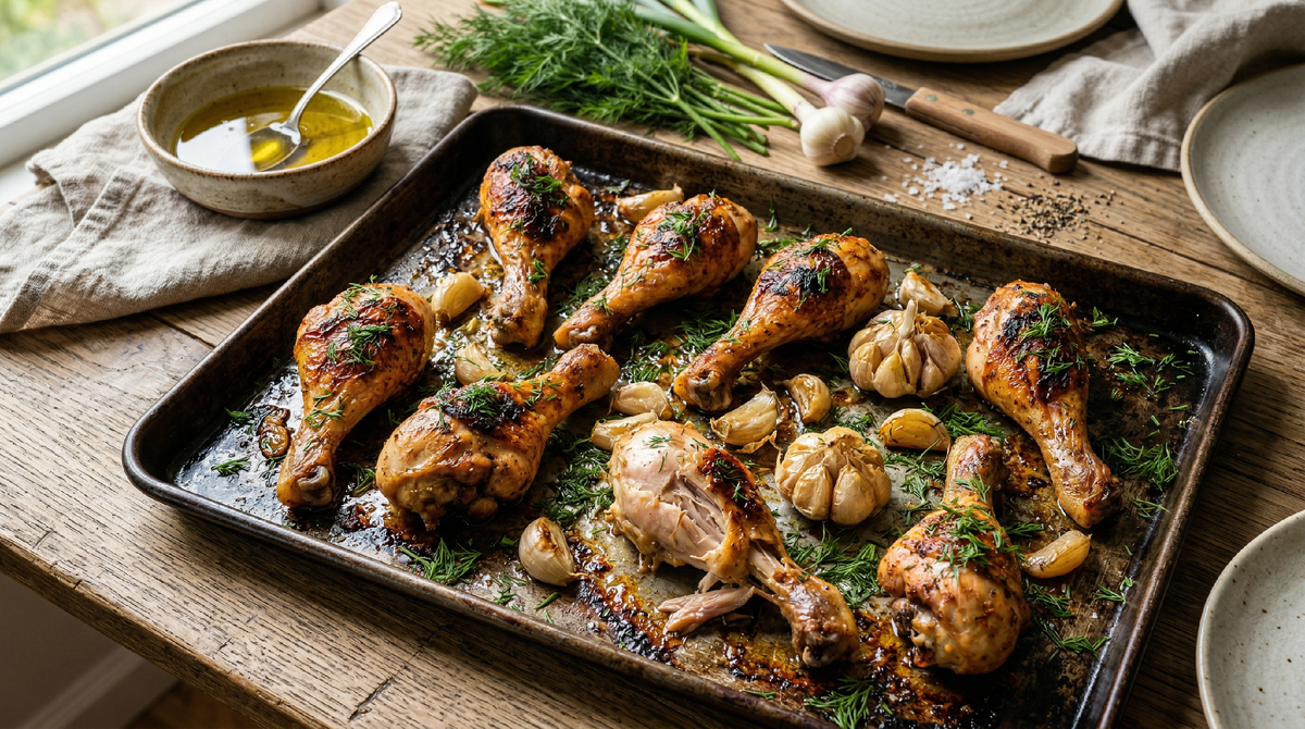 Из продуктов мне нужны восемь-десять куриных голеней, большой пучок молодого чеснока с зелёными перьями, щедрый пучок свежего весеннего укропа, три-четыре столовых ложки подсолнечного или оливкового масла, соль, чёрный молотый перец. Иногда я добавляю щепотку сладкой паприки для цвета и чуть-чуть лимонного сока, буквально от половинки лимона. Но это по настроению, базовый набор — чеснок, укроп, масло, соль, перец. Всё.