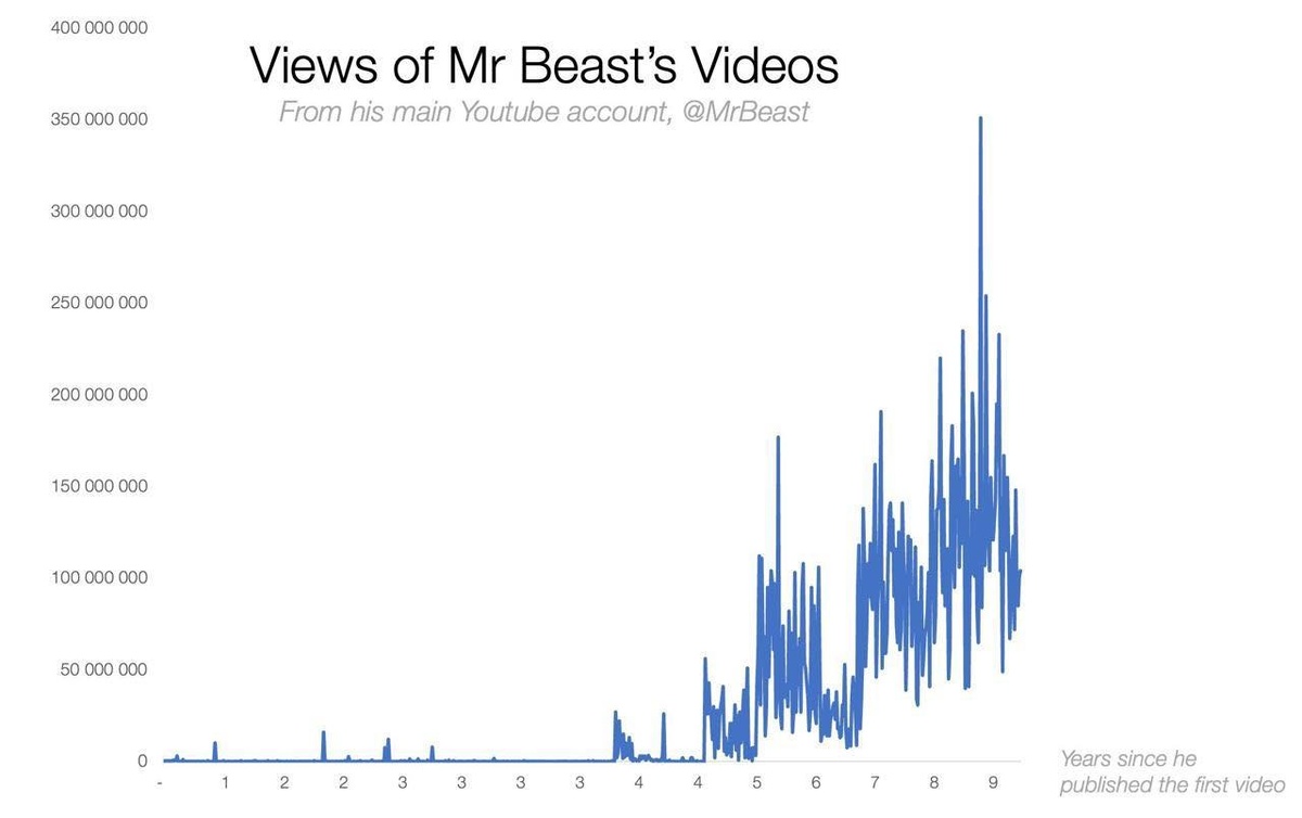 На графике просмотры его видео по количеству годов, после публикации первого видео. Чувак не сдался, у него может быть и цели не существовало, он просто шел своим путем :) как Мандалорец. В итоге - добился славы, известности и бабулек. Вывод? Ну видимо такой, что к целе надо идти упрямо, но откровенно говоря в жизни полно примеров, когда долбишься в пустоту :) @clickfraud.ru