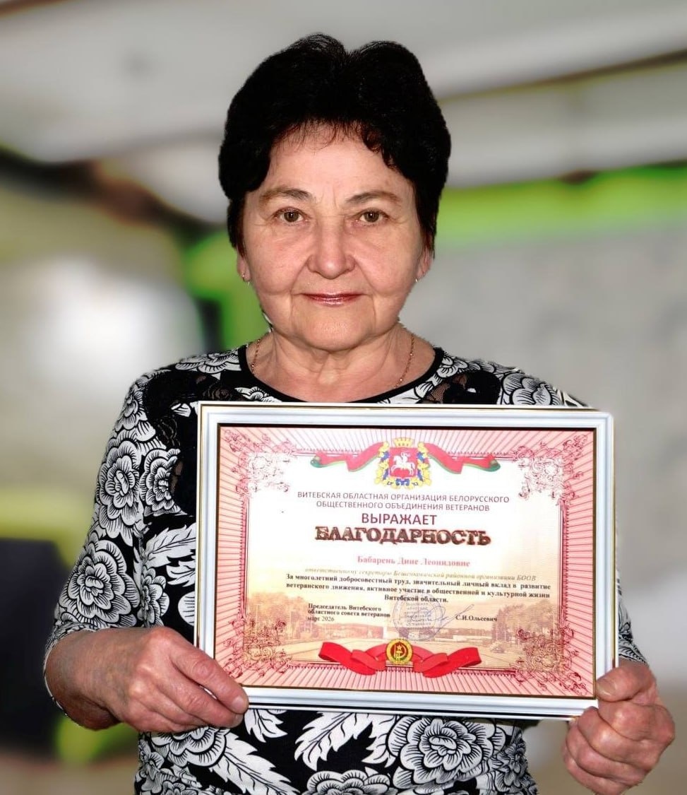 ! 🔥 Благодарность Витебской областной организации Белорусского общественного объединения ветеранов объявлена ответственному секретарю Бешенковичской районной организации объединения Дине Бабарень. ⭐Дина Леонидовна удостоена почётной награды за многолетний добросовестный труд, значительный личный вклад в развитие ветеранского движения, активное участие в общественной и культурной жизни Витебской области. ⚡ Поздравляем с заслуженной наградой!