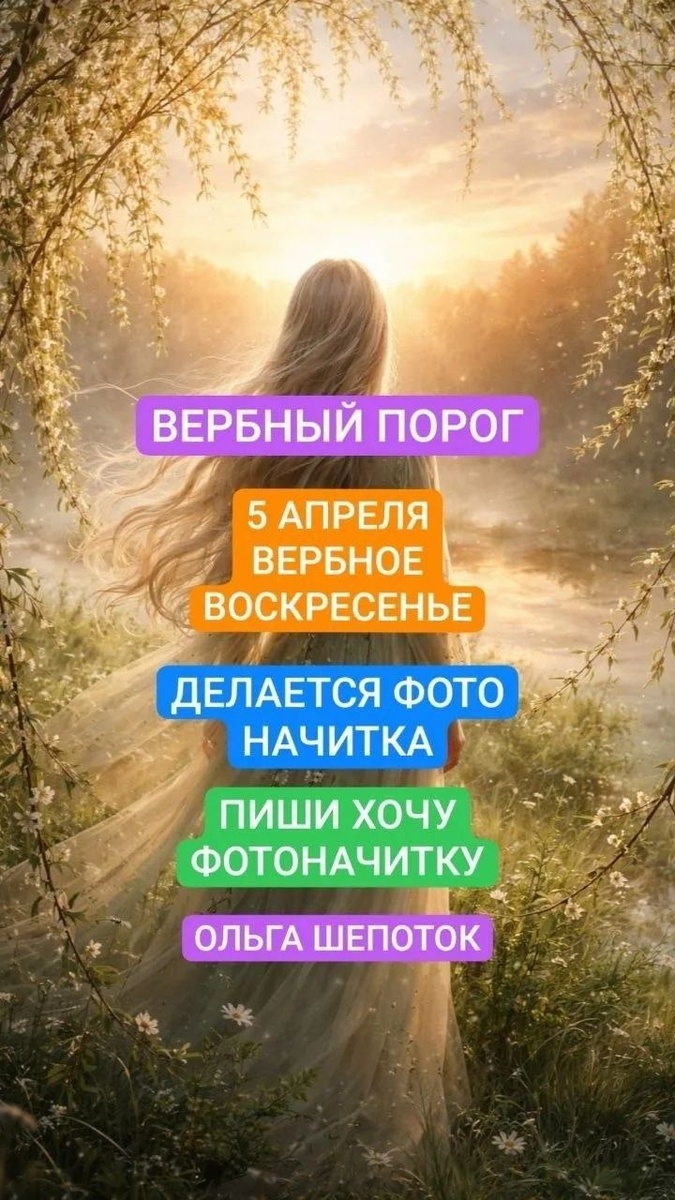 ) "Вербный порог". Фотоначитка на Вербное Воскресенье. 5 апреля — день, когда Небо ближе, чем кажется, день, когда верба слышит. В этот день открыта тропа меж мирами, и слово доходит туда, где ждут помощь. Так раньше бабки начитывали на воду, хлеб, да на образ. Теперь — на фотографию. Это не просто снимок. Это живая ниточка к человеку. В этот день я читаю особые шепотки над вашими фотографиями — чтобы направить силу туда, где она особенно нужна. Обозначаете нужную тему. Присылаете фото — я делаю настройку через шёпотки и практики. 🔹 Возможные темы начитки: 1️⃣ Очищение от тяжести и боли 2️⃣ Пробуждение силы и пути 3️⃣ Защита и благословение 4️⃣ Чтобы здоровье держалось 5️⃣ Мир и лад в семье 6️⃣ Чтобы любовь пришла 7️⃣ Чтобы жизнь наладилась 8️⃣ (Ваша тема): Дайте мне знать, какую тему вы бы хотели добавить, и я проведу соответствующую начитку 🌱 🪻 🌱 🪻 🌱 🪻 🌱 Благодарственный донат за начитку на одну тему с фотографией 399 ₽ Запрос на начитку делаем по моей ссы