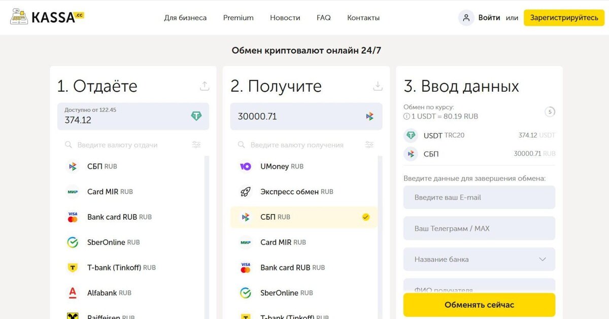 - Выбор направления: Заходишь на Kassa.cc и выбираешь, что отдаешь и что хочешь получить. Например, RUB → USDT (TRC20). Интерфейс интуитивный, даже без подсветки все понятно;