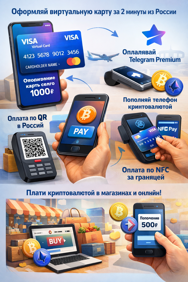 В 2026 году миллионы пользователей в России продолжают искать удобные и надежные способы оплатить Telegram Premium без лишних сложностей. Решение оказалось проще, чем кажется: достаточно оформить виртуальную зарубежную карту Visa, и уже через пару минут вы сможете активировать подписку. Сервис позволяет получить карту за 2 минуты прямо из дома, без очередей и лишних документов. Виртуальная карта Visa выпускается зарубежным банком и полностью адаптирована под российские реалии. Стоимость оформления карты за 1000 рублей — это всё, что потребуется для старта. После выпуска вы самостоятельно управляете балансом и пополняете карту рублями в любое удобное время. Никаких ограничений и скрытых комиссий — независимое пополнение баланса делает услугу по-настоящему комфортной. С такой зарубежной платежной картой вы не только оплатите Telegram Premium картой, но и сможете платить по QR-коду криптовалютой в любых магазинах и маркетплейсах России. Просто переводите крипту на карту и расплачивайтесь