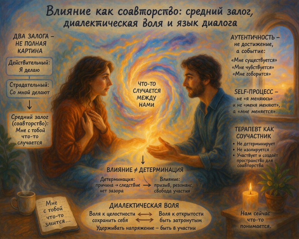 Диалектическая воля — это способность удерживать себя в среднем залоге. Быть участником (открытость) и иметь позицию (целостность) одновременно. Это и есть способность влиять и быть под влиянием, не теряя себя.