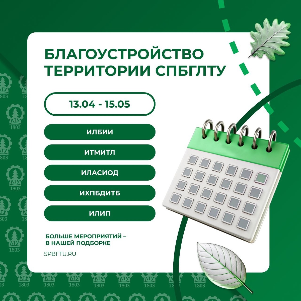 С 13 апреля по 15 мая 2026 года в нашем университете пройдёт весенний месячник по благоустройству территории после зимнего периода. День благоустройства состоится 25 апреля 2026 года. График проведения мероприятий, с 9:15 до 17:00: 📍 Институт лесного бизнеса и инноватики — с 13 по 17 апреля 2026 года 📍 Институт технологических машин и транспорта леса — с 20 по 24 апреля 2026 года 📍 Институт ландшафтной архитектуры, строительства и обработки древесины — с 27 по 30 апреля 2026 года 📍 Институт химической переработки биомассы дерева и техносферной безопасности — с 4 по 8 мая 2026 года 📍 Институт леса и природопользования — с 12 по 15 мая 2026 года День благоустройства (субботник) — 25 апреля 2026 года, с 10:00 до 13:00. Сбор участников у главного корпуса. Сбор участников в остальные дни: у административно-лабораторного корпуса Ботанического сада, Институтский пер., д. 5, лит. С. Форма одежды — рабочая. Приводим территорию в порядок вместе! 💚 #СПбГЛТУ #СПбГЛТУ_анонс 👻 МАХ |
