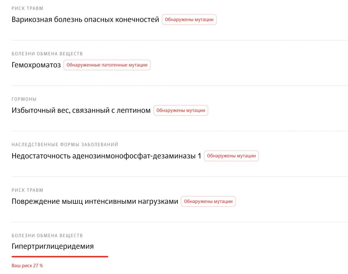 Интересно было посмотреть происхождение и риски заболеваний. Мне часто говорят, что я похожа на чеченку, татарку, цыганку и много каких еще мне приписывали черт. Родители говорят, что мы 100% русские. Но выяснилось, что около 20% во мне от жителей Коми. Немного татар. Отсюда, видимо, отклонения от чисто славянской внешности. По рискам заболеваний - ничего критичного, главное - выполнять рекомендации, которые предотвращают развитие того, в чем есть генетическая предрасположенность. Посмеялась, что высокий уровень паранойи. Пока не решила, что с этим делать.