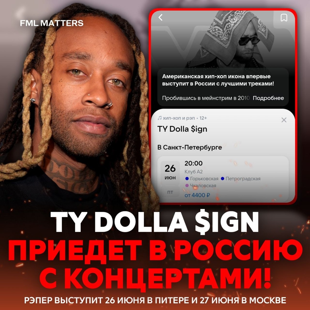 ! Ty Dolla $ign соратник и друг Йе, Beyoncé и Drake, приедет с концертом в Россию. По информации сервиса VK Билеты, его выступление запланировано на 26 июня 2026 года в Санкт-Петербурге — шоу пройдёт в клубе A2 в 20:00. Стоимость билетов — от 4400 рублей. Ждём? ❤️🔥/👎 💀 FML MATTERS