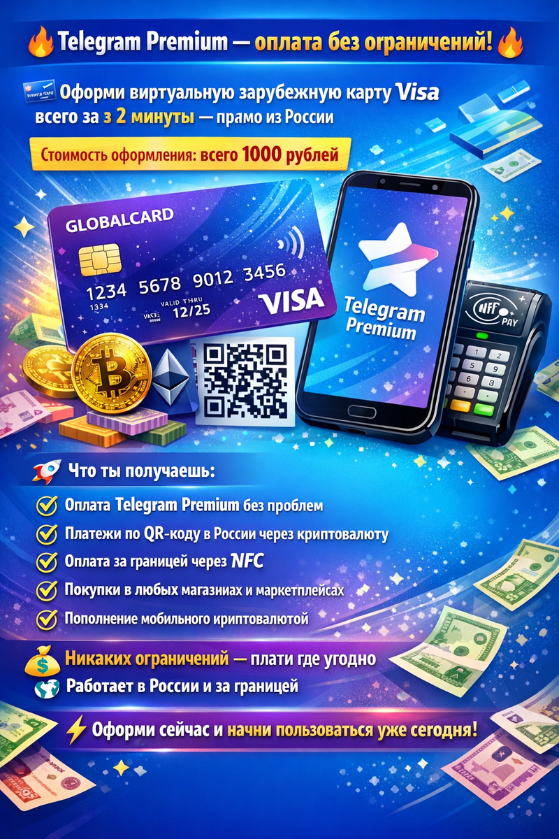 В современном мире подписка на Telegram Premium стала настоящей необходимостью для тех, кто хочет пользоваться всеми преимуществами мессенджера. Но что делать, если обычные российские карты не проходят? Решение есть — виртуальная зарубежная карта Visa, которую реально оформить за 2 минуты прямо из России. Сервис позволяет самостоятельно пополнять рублями баланс карты и сразу использовать её для оплаты Telegram Premium. Всё просто, быстро и без лишних посредников. Оформление карты обойдётся всего в 1000 рублей, а дальше вы сами управляете средствами. С такой виртуальной Visa вы можете платить по QR-коду в России криптовалютой буквально в любых магазинах и маркетплейсах. Никаких ограничений: супермаркеты, онлайн-магазины, сервисы доставки — всё работает. А если вы за границей, то оплата по NFC открывает двери везде, где принимают бесконтактные платежи. Ещё один приятный бонус — пополнение баланса телефона криптовалютой в России. Теперь мобильная связь тоже оплачивается мгновенно и без ко