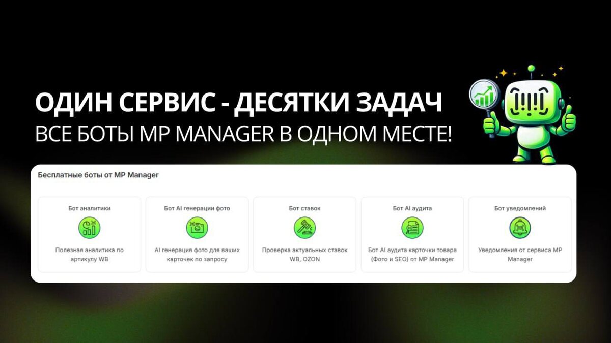 Все боты MP Manager в одном посте! Мы разработали линейку Telegram-ботов, которые помогают продавцам эффективно работать на Wildberries, Ozon и Яндекс Маркете. Каждый бот решает конкретную задачу – от расчётов до аналитики и AI-инструментов. ⚫️ @mpmgr_bot Основной бот сервиса MP Manager Универсальная точка входа. Быстрый доступ ко всем инструментам. ⚫️ @mpmgr_support_bot Бот технической поддержки Оперативная помощь по вопросам, связанным с работой сервиса. Здесь решаются любые технические проблемы. ⚫️ @mpmgr_notifications_bot Бот уведомлений от MP Manager Позволяет настроить получение важных уведомлений сервиса напрямую в Telegram. ⚫️ @mpmgr_coupons_bot Бот купонов Доступ к пятничным купонам и бонусам от MP Manager для пользователей сервиса. ⚫️ @mpmgr_analytics_bot Бот аналитики Wildberries Предоставляет сводную информацию по продажам за последние 30 дней. Полезно для оценки эффективности и планирования. ⚫️ @mpmgr_positions_bot Бот проверки позиций на Wildberries и Ozon Отслежив