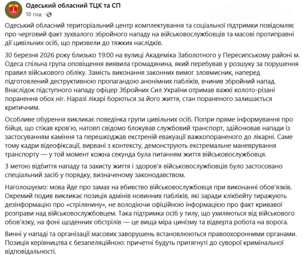 Одесский ТЦК заявляет, что мужчина первый напал на них с ножом, потому что был «заранее подготовленным деструктивной пропагандой анонимных