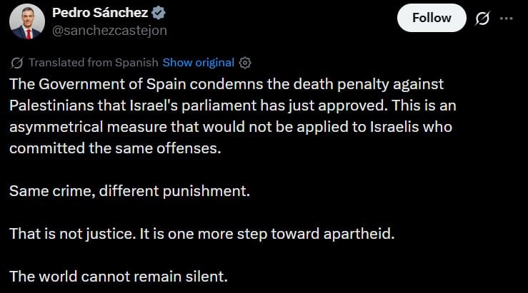 Spanish PM Sanchez CONDEMNS Israel for its approval of death penalty for Palestinians