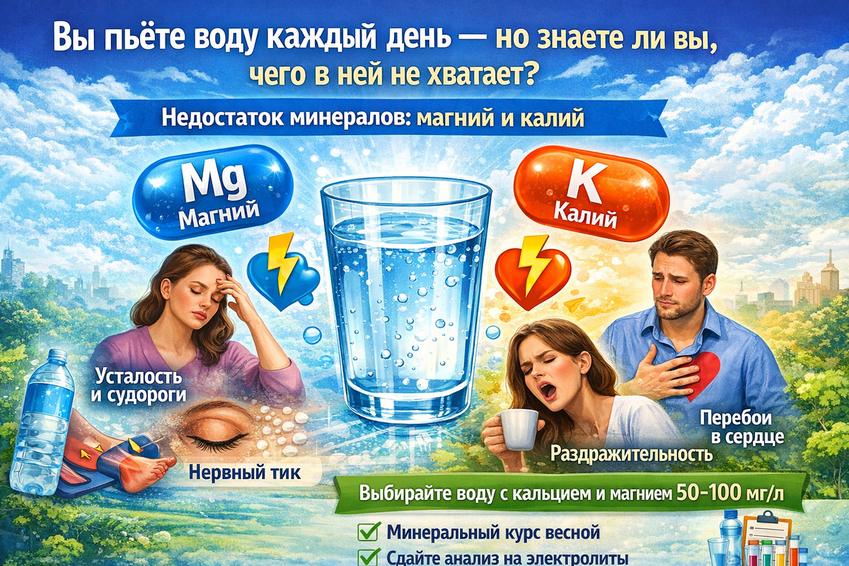 Каждую весну миллионы людей жалуются на усталость, раздражительность и судороги в ногах. Врачи разводят руками: «Авитаминоз, попейте витамины». Но причина нередко куда проще — и буквально у вас на кухне. Дело в воде, которую вы пьёте каждый день. Большинство уверены: вода из фильтра или бутылки — чистая и полезная. Отчасти это правда. Но есть нюанс. В водопроводной воде действительно могут присутствовать кальций, магний, калий, натрий и микроэлементы. Но их количество зависит от региона. Например, в Новосибирской области вода хронически бедна фтором и селеном. А жители крупных городов нередко получают воду с запахом сероводорода, металлическим привкусом или мутностью — всё это следствие старых труб и несовершенной очистки. Парадокс в другом: многие фильтры удаляют не только вредное, но и полезное. Полностью деминерализованная вода — тоже не подарок для организма. По разным оценкам, дефицит магния испытывают большинство городских жителей — просто не догадываются об этом. Калий уходит вм