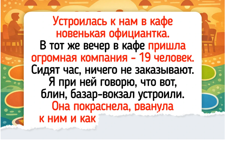 - Устроилась к нам в кафе новенькая официантка. В тот же вечер пришла огромная компания — 19 человек. Сидят уже час, но ничего не заказывают. Я при ней говорю, что вот, блин, базар-вокзал устроили. Она покраснела, рванула к ним и как рявкнет им что-то. Они быстро сделали заказ. Оказалось, это ее семья пришла посмотреть на ее первый рабочий день.