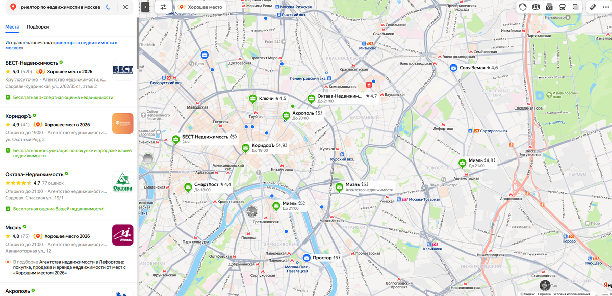 Профили из Галереи услуг часто показываются в основной выдаче Яндекса на первых позициях. То есть, когда пользователь вводит «риелтор Москва», он видит не только сайты, но и карточки специалистов из Галереи. Это дополнительный бесплатный трафик.