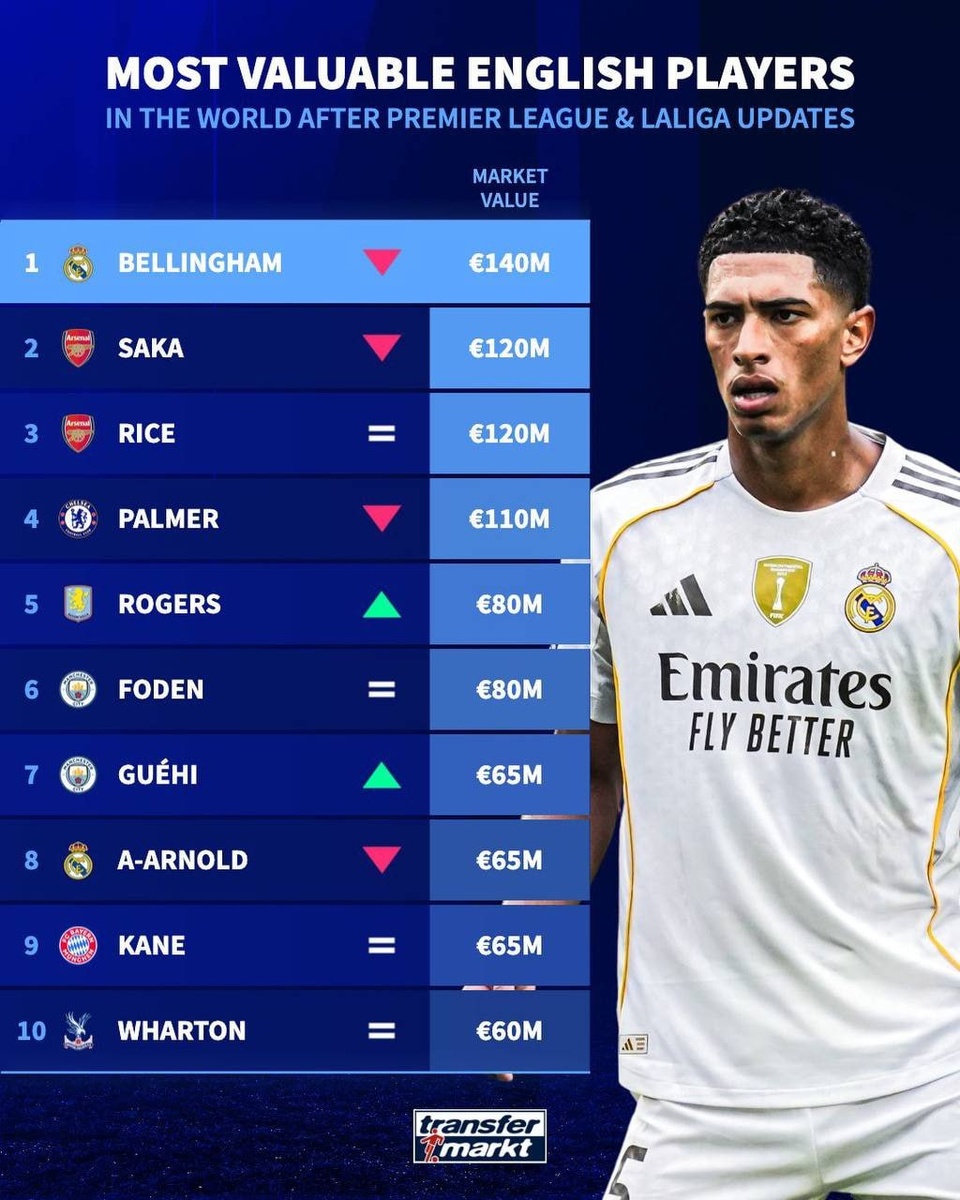Самые дорогие британцы после обновления стоимости игроков Ла Лиги и АПЛ по версии Transfermarkt