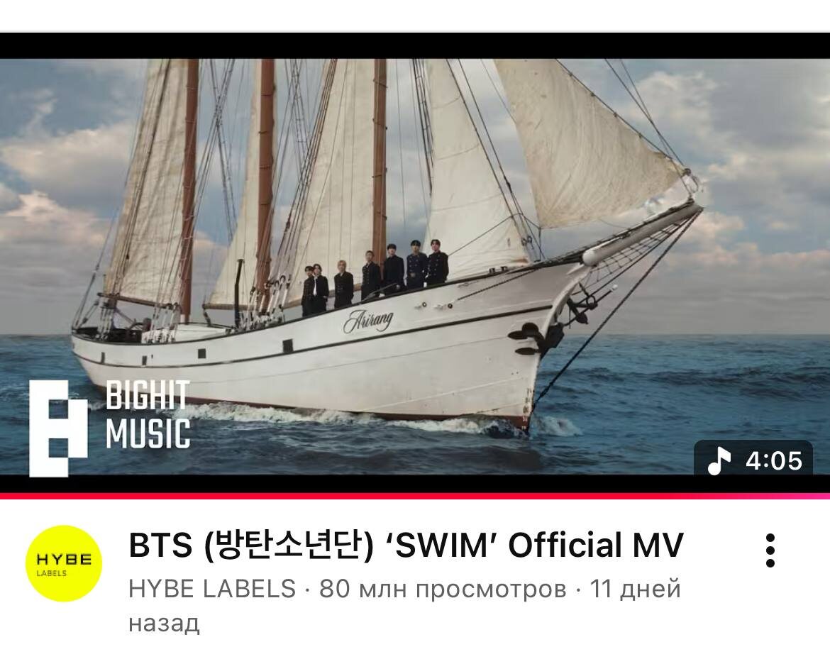 🌷 Клип на песню "Swim" набрал более 80 миллионов просмотров на YouTube