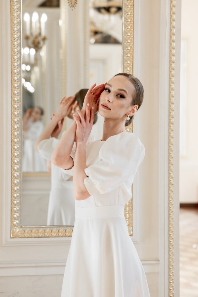 Что делает невеста? Она всегда прихорашивается по утрам, смотрит в зеркало, любуется собой, играет с фатой, поправляет серёжку, надевает украшения. Все эти моменты мы можем срежиссировать и красиво отснять. Если мы снимаем в помещении и у нас нет дополнительных источников света, мы используем свет от окна. Невеста смотрит в окно, задаем ситуацию, как будто она ждёт жениха, словно он сейчас подъезжает. Даже если мы сейчас в отеле и попросили выйти жениха, чтобы пофотографировать невесту одну. Тогда невесте лучше погрузиться в эту ситуацию, то есть мы как бы снимаем кино с историей. У нас фотосессия обретает смысл. И вообще, все девочки любят любоваться собой в зеркало, красоваться, большинство любят съёмки и обычно с невестами на фотосессии у фотографов нет проблем.
