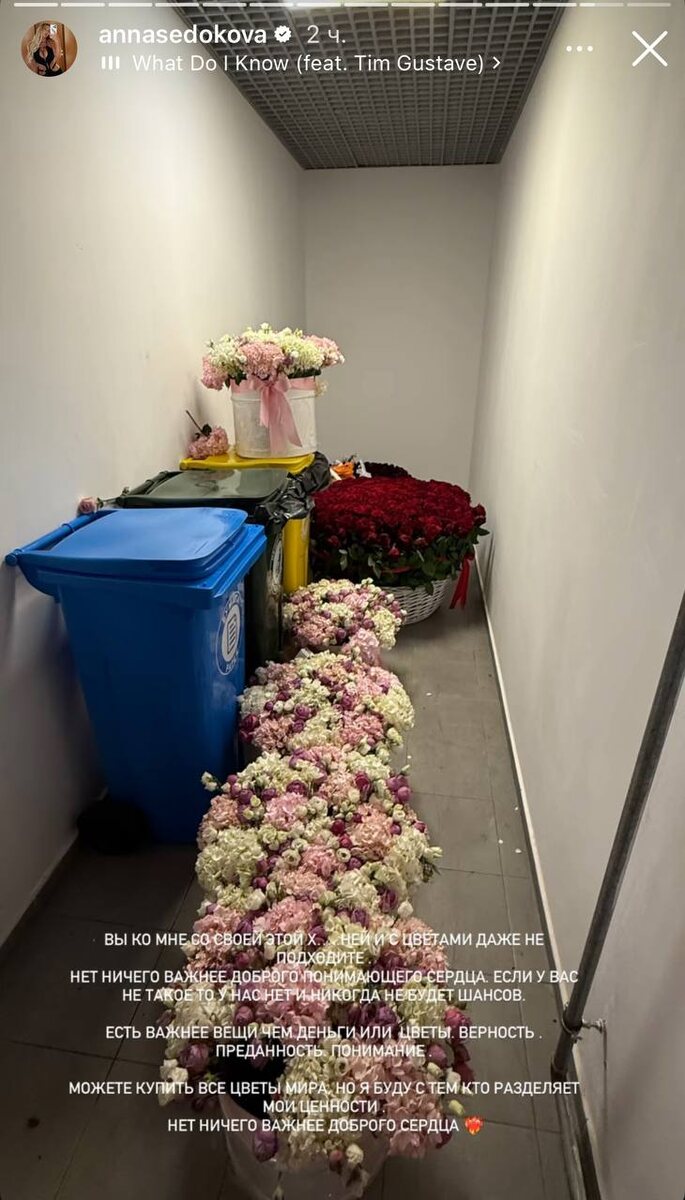 Анна Седокова хвастается тем, что выкидывает подаренные цветы на помойку, так как она ценит только доброе сердце.