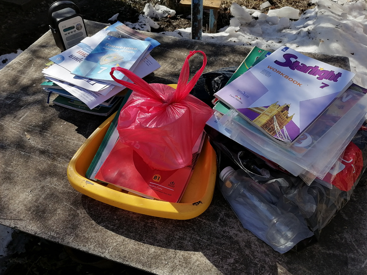 Набрала два пакета вещей на выброс. Сразу отнесла на мусорку. Ненужный бумажный мусор сожгла в мангале.