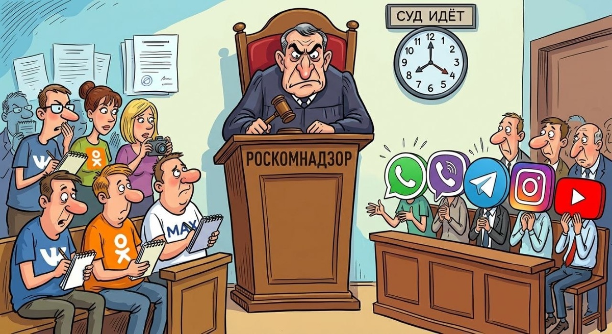 Актуалочка от подписчика Антона Карикатура изображает судебный процесс над популярными интернет-сервисами и социальными сетями, символизируя их регулирование или ограничения. В центре за трибуной, подписанной «Роскомнадзор», находится судья. На скамье подсудимых сидят антропоморфные логотипы WhatsApp, Viber, Telegram, Instagram и YouTube. На стене висят часы с надписью «Суд ИДЁТ». Рядом стоят журналисты с логотипами на футболках VK, OK, MAX генерировать без лишних мучений можно в веб агрегаторе нейросетей gptunnel(промокод на скидку 75% PROMPT1_75 ) или телеграм боте Syntx Еще у нас есть группа VK и сайт-каталог промптов https://prompt1.ru/ #ужасы@prompt1_ru