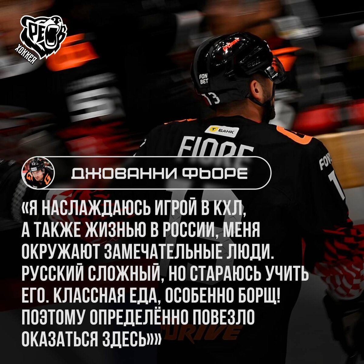 ! После яркой победы «Авангарда» над «Нефтехимиком» в четвёртом матче серии Кубка Гагарина, нападающий омского клуба Джованни Фьоре рассказал, что ценит в жизни за пределами льда. Канадский хоккеист признался, что наслаждается не только игрой в КХЛ, но и пребыванием в стране: «Я наслаждаюсь игрой в КХЛ, а также жизнью в России, меня окружают замечательные люди. Русский сложный, но стараюсь учить его. Классная еда, особенно борщ! Поэтому определённо повезло оказаться здесь». 🐻 Слышишь? ЭТО РЁВ ХОККЕЯ