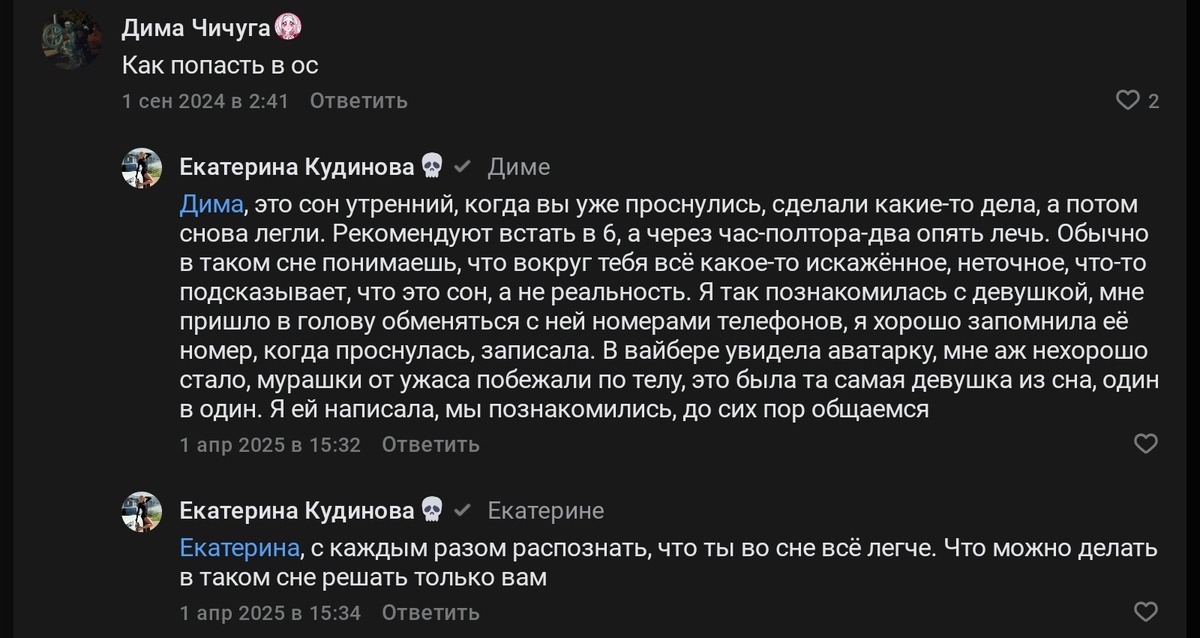 После выкладки статьи об моем осознанном сне, без всякого намерения решила почитать о том бывали ли случаи встреч незнакомых людей в таких снах. Поисковик выдал множество ссылок, второй была на канал в ВК Степана Юсина ( на него я подписана) статья за апрель 2025г.