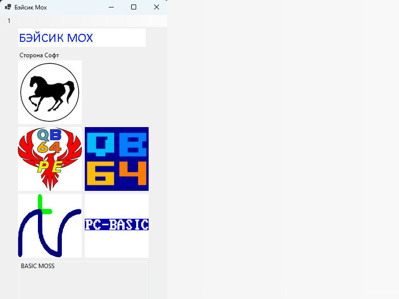 Новая разработка. С идеей. Как мох. Вот мох растет такой зеленый и пушистый. И мох – это среда такая. Это про бэйсик будет программа. Крайне небольшая. Программа имеет 2 основные функции. И может быть, вдруг, будет даже полезна. В теории. Если идею развить. Первая функция. Это сторона вэб. Про интернет и Бэйсик. Тут ты можешь увидеть ссылки на популярные диалекты Бэйсика. И посмотреть их сайт, чтобы лично посмотреть их сайт. Посмотреть обновление . Скачать его. Вторая сторона это локальная сторона. Сторона софт. Программы. Тут ты можешь их все запустить. Эти диалекты Бйэсика. Уже на своей машине. Чтобы удобно было в одной программе такой вот запуска. Получается две стороны. Две кнопки переключения между режимами. Сторона Вэб. Чтобы посетить сайт разработчиков. И сторона софт. Чтобы запустить установленный локально язык программирования. Это все дело посвящено языку программирования Бэйсик. И тут я собрал несколько его популярных диалектов. Это КБ 64 (QB64). Его вариант КБ64 Феникс Прое